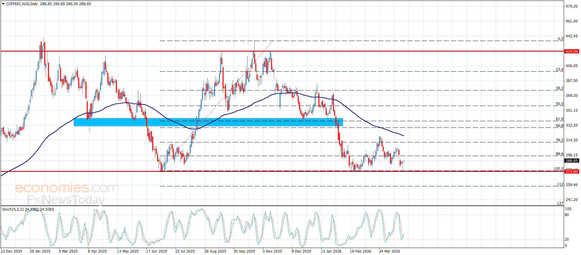 De koffieprijs verloor in de laatste handelsdag zijn positieve momentum, waardoor er nieuwe neerwaartse bewegingen ontstaan. De prijs zal naar verwachting de steun op 276,00 opnieuw testen en er vervolgens bovenuit komen. Stabiliteit boven de huidige steun zou echter een opwaartse correctie kunnen stimuleren. Een prijsstijging naar 297,00 is te verwachten, waarna de koers verder zal stijgen richting het volgende obstakel rond 312,00.