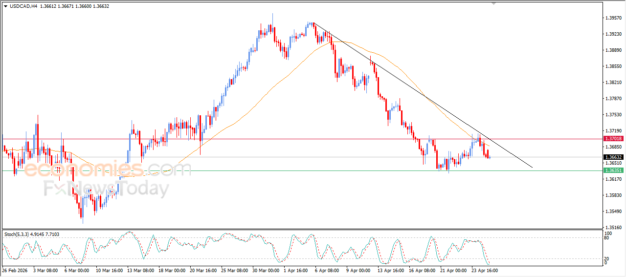 Het USDCAD-paar daalde tijdens de recente intraday-handel, nadat de prijs onder het belangrijke weerstandsniveau van 1,3700 zakte, zoals eerder verwacht. Dit gebeurt te midden van aanhoudende neerwaartse druk door de handel onder de EMA50, wat de dominantie van een kortetermijncorrectieve neerwaartse trend versterkt, vooral omdat de prijs langs een ondersteunende neerwaartse trendlijn beweegt.
